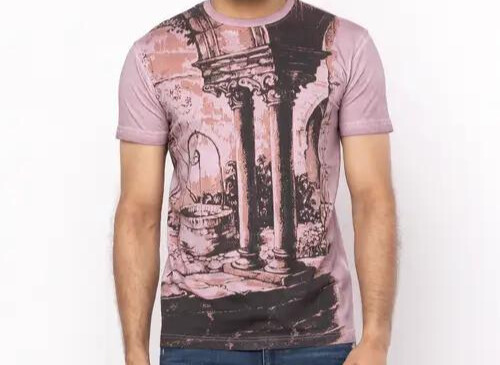 Mauve dyed single jersey knit cotton t-shirt with multicolour prints. Rib-knit round neck.